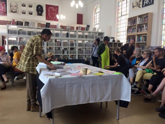 Curating Borderless Spaces, the programme’s finale was hosted by the Live Art Development Agency (LADA) featuring a day of participatory key note on decolonial practices by Raju Rage, exhibition of the commissioned works, talks, food, and an open conversation peppered with provocations by Bojana Janković, Dana Olărescu, Kai Syng Tan, Helena Walsh. The day’s writer in residence was Season Butler who responded to the stimuli of the day through a durational live writing (here her original text) and a final performance that closed the day.
